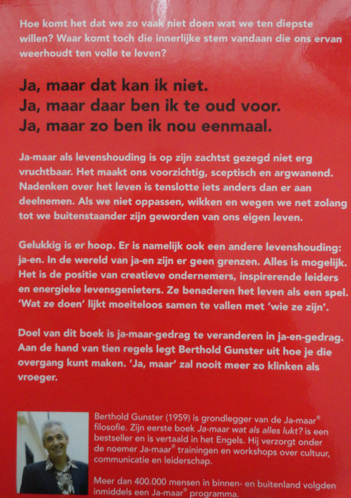 Ja maar, ja maar en nog eens ja maar. We horen het elke dag zo vaak dat we er gefrustreerd van raken. Ja-maar als levenshouding lijkt dan ook niet erg vruchtbaar. Het is voorzichtig, argwanend en defensief. Het maakt mensen tot buitenstaander van hun eigen leven. Nadenken over het leven is tenslotte iets anders als er aan deelnemen. Dit boek gaat in op het hoe en waarom van Ja-maar en vooral over de twee alternatieven: Ja-en en Nee-want.